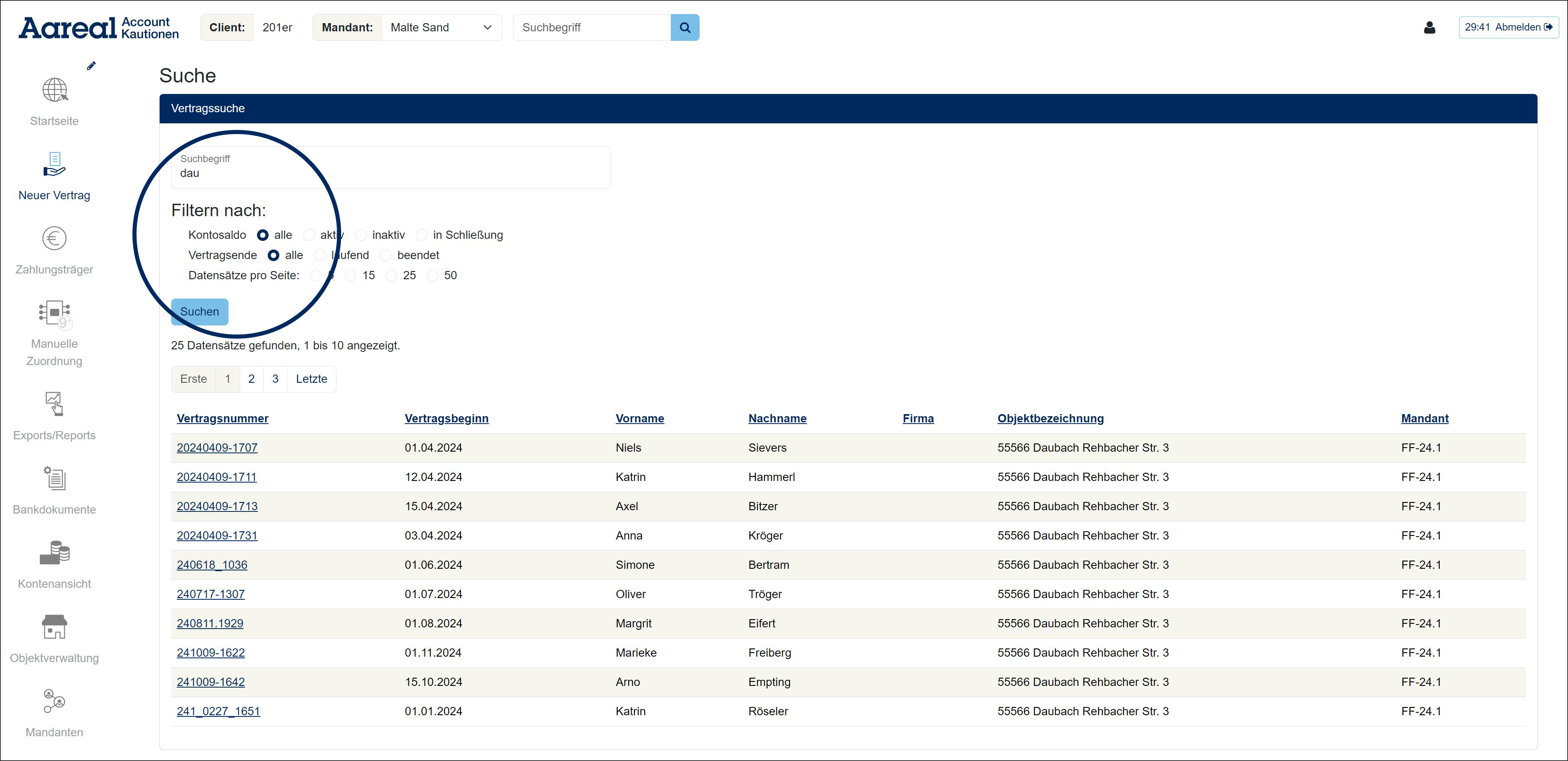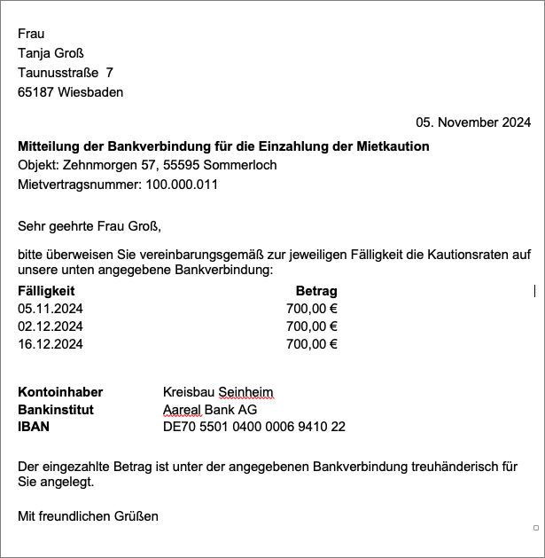 Zuerst sind die Stammdaten einzutragen, so wie sie im Mietvertrag zu finden sind. Das dauert in der Regel nur wenige Minuten. Mit diesen Angaben stellt Ihnen Aareal Account Kautionen sofort eine persönliche virtuelle IBAN zur Verfügung, die Sie Ihrem Mieter mitteilen. Diese kann er umgehend nutzen, um per Überweisung Einzahlungen zu tätigen, die zu 100 % sicher verwaltet und ihm zugeordnet werden.